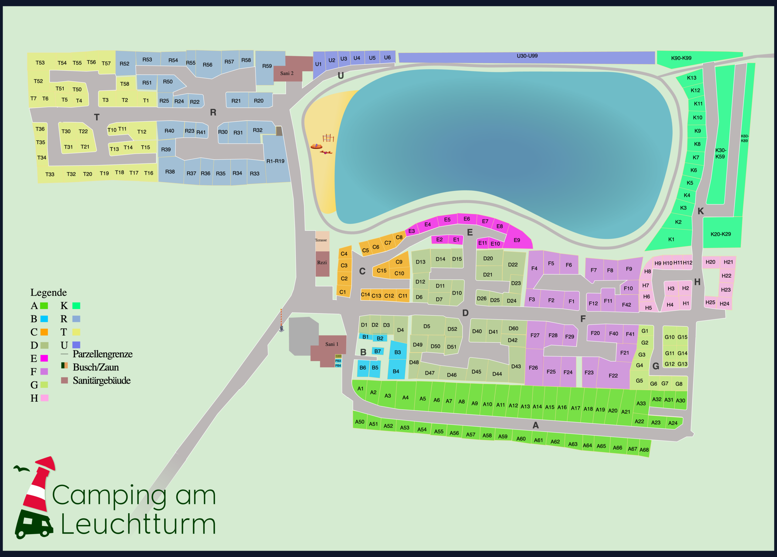 Unser Platz verfügt über etwa 450 Stellplätze sowie mehrere große Wiesen für Zelte, größere Gruppen und Vereine.